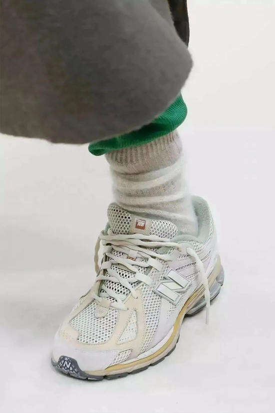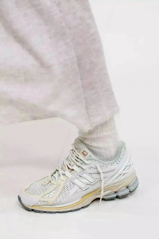 AURALEE 此次与 New Balance 合作才用了 1906R 这个鞋型,区别于此前合作的 550,1906R 更具复古感。鞋身采用白色网面贯穿,在细节处加入的偏黄白色皮革,令整体复古氛围更为浓郁。