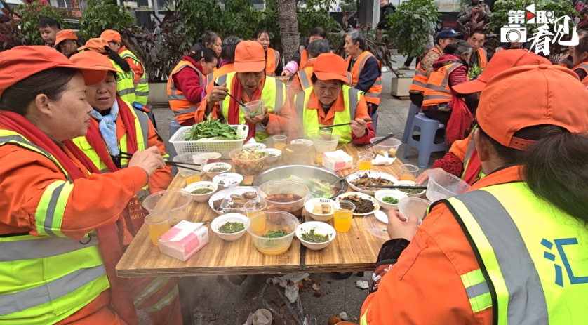 今年的盛宴,比往年更热闹。磁器口轨道站旁的广场上,里外外摆了70多桌,从广场到轨道站的近千平方米区域,全是为环卫工们准备的“暖心主场”。