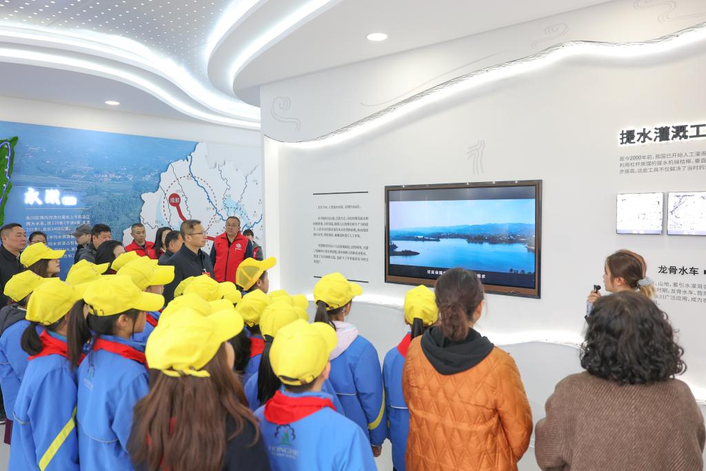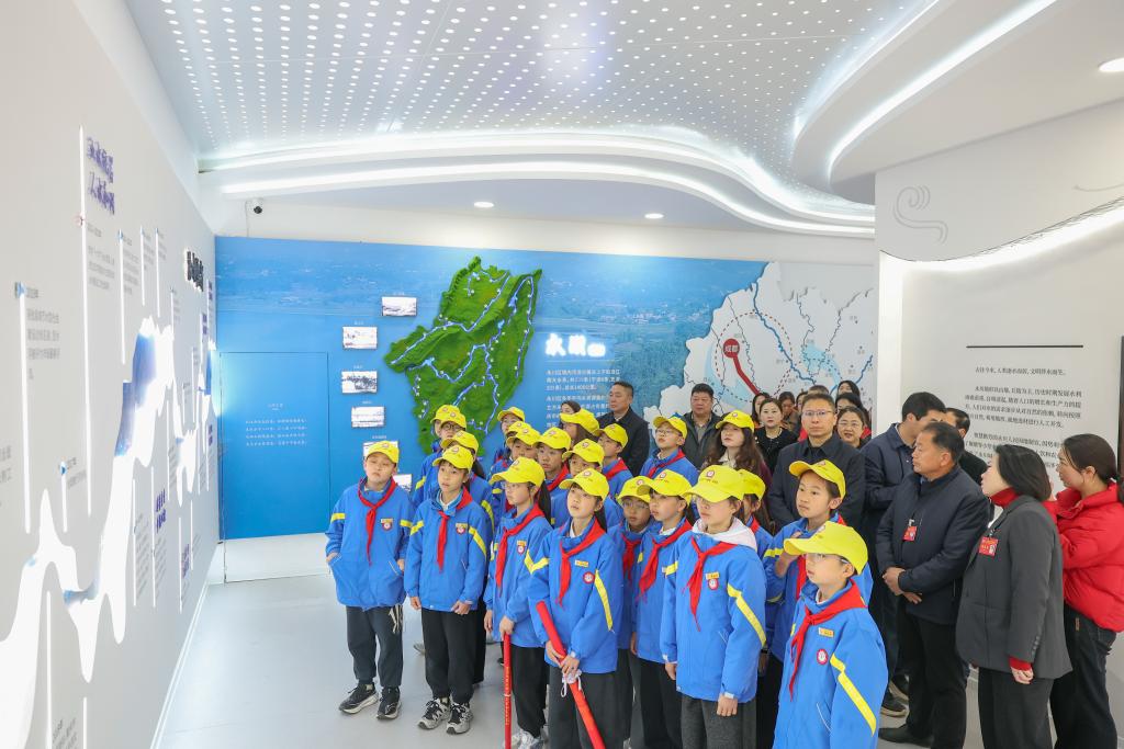 3月20日,在重庆市永川区临江河水文化展示馆,红河小学“小黄帽”志愿服务队的同学和部分巡河代表在观看提水灌溉工程介绍。