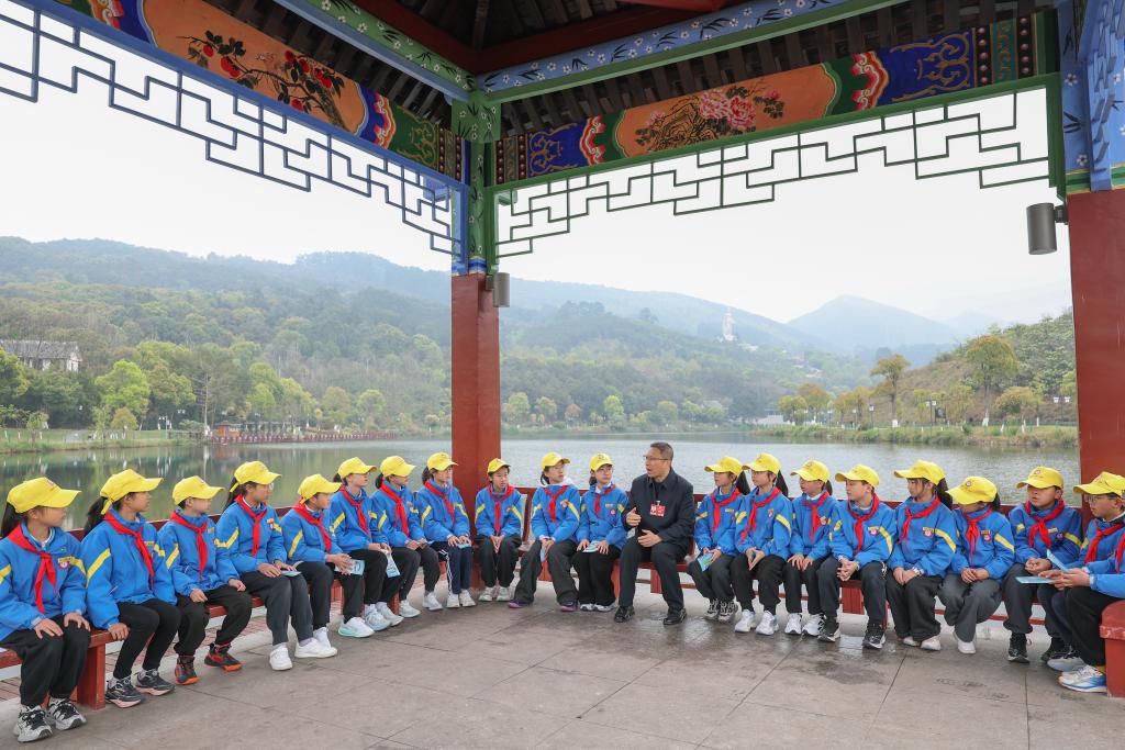 3月20日,在重庆永川区神女湖边,全国人大代表傅国涛向参加“世界水日”“中国水周”科普实践体验活动的红河小学“小黄帽”志愿服务队的同学分享生态环境法典与日常生活的关系。